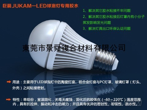 JUKAM巨箭LED球泡灯专用胶水是一种单组分室温固化密封、粘接胶水,主要用于LED球泡灯中的陶瓷灯座、铝合金灯座与PC灯罩、玻璃灯罩(灯头、外壳)之间粘接密封,解决了LED球泡灯在粘接过程中的几大问题(1、用其它胶水粘接不牢问题,2、其它胶水粘接后灯罩内有小分子挥发影响发光问题,3、灯具出口环保认证问题。),它能在室温下与空气中的水分结合引起交联,硫化成为高性能弹性体,它是一种优良的金属及非金属材料的粘结剂和密封胶。胶料能与金属、玻璃、陶瓷及众多材质良好的粘结,并能对多种电子元器件起到粘结、密封的作用;对使用场合的周围环境不会产生污染。固化后的胶体,充分的发挥有机硅材料的优异电器特性,在(-60~220℃)温度范围内,具有抗拉伸、振动和冲击的能力;并且具有优异的耐侯性、耐热性、耐寒性、疏水性。
