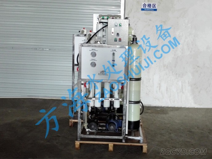 在90年代以前,船上用水问题的彻底解决办法是自己能供应生活用水和饮用水。为了解决船用淡水问题,人们说的多做的少,原因是船用海水淡化器价格昂贵,操作复杂,工作时间小于维护维修时间,毛病的出现令人感到船用海水淡化器可有可无,人们的热情开始冷淡。随着新技术材料的不断出现,我公司研发人员分析了以前国内外设备的优缺点,研制出了一种体积小、重量轻、占地省,安装方便、适应性强,寿命长,设备操作简单,维修方便,安全可靠,设计新颖巧妙,避免了频繁的清洗,无环境污染的船用海水淡化器,1吨船用海水淡化器利用反渗透原理来制造淡水的设备,通过船上的实际应用,感到方便、可靠,产水量能得到保证。在总结前套样机经验的基础上,对船用海水淡化器又做了较大的改动,根据船上的人数、需要,设备可大可小。一级出水作为生活用水(相当于自来水),二级出水作为直接饮用水(卫生毒理学指标完全符合GB17324-2003标准)。