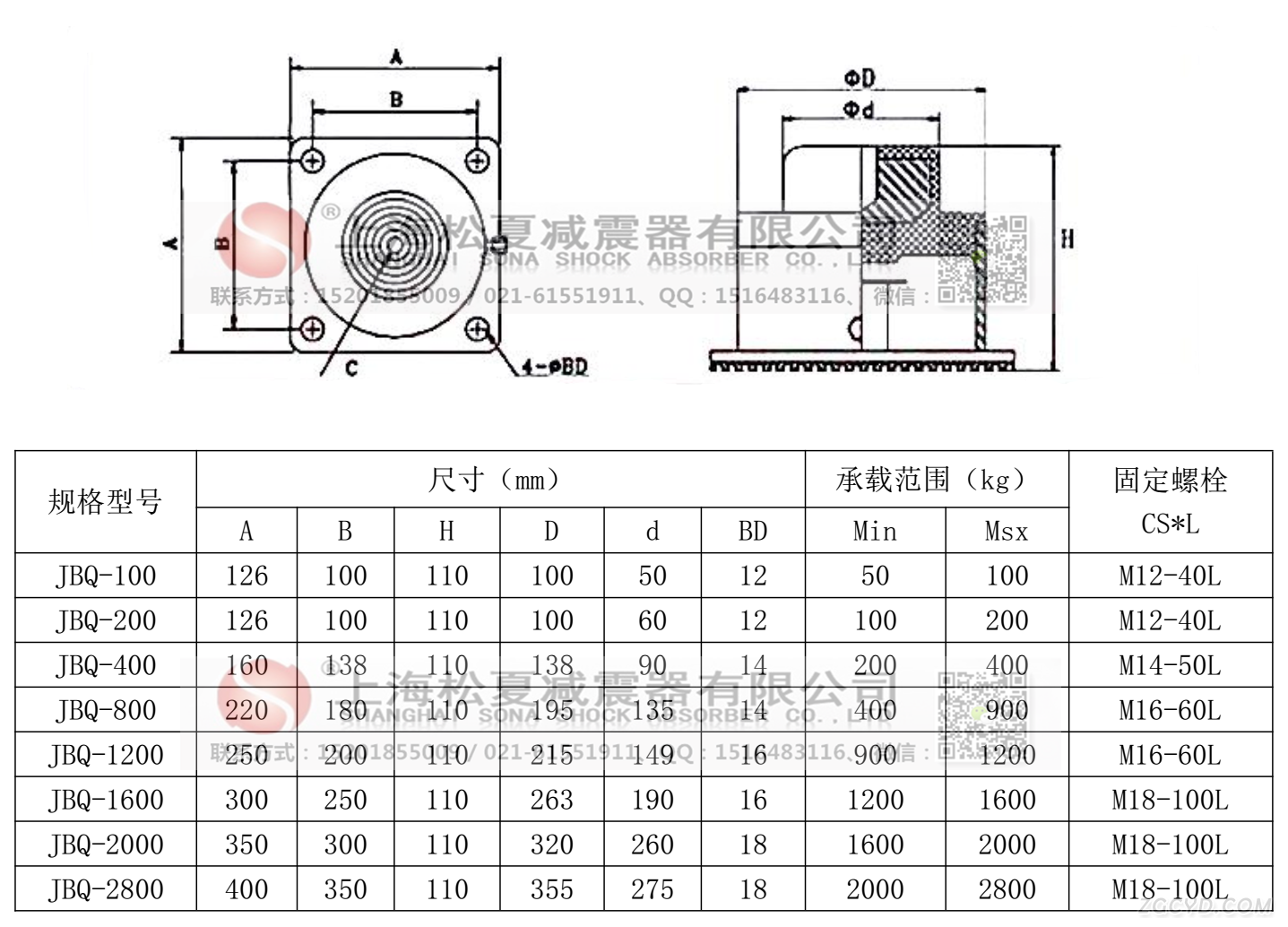 JBQ气垫式减震器尺寸表: