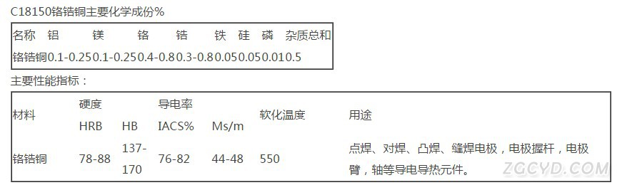 C18200铬锆铜化学成分: Cr铬: 1.0; P磷: 0.002; Mn锰:0.0005; As砷:0.0002; Si硅:0.001; Fe铁:0.045; Mg镁:0.0006; Sn锡:0.0065; Al铝:0.0010; Bi铋:<0.0001;