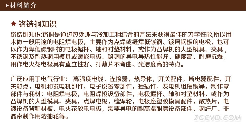 铬锆铜有良好的导电性,导热性,硬度高,耐磨抗爆,抗裂性以及软化温度高,焊接时电极损耗少,焊接速度快,焊接总成本低,适合作为熔接焊机的电极有关管件,但对电镀工件表现一般。