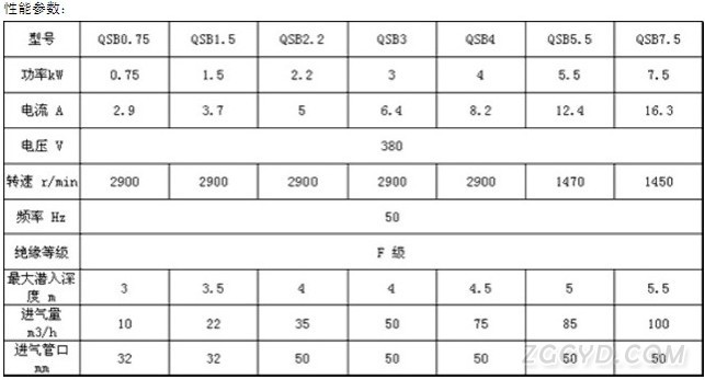 注:表中进气量及增氧能力是在标准试验条件下(20°C水温,气压101.325kPa),曝气机潜水深度3m,试验介质为清水。在中度污水中,增气能力可按系数0.85作为设计依据。