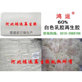 鸿运再生胶厂生产的60%乳胶再生胶以马来西亚进口废乳胶手指套为原料,通过破碎、脱硫、消毒、烘干、成型等工艺制作完成,含胶量为60%,可按2:1替代部分天然胶或与天然胶并用生产浅色模压橡胶制品。