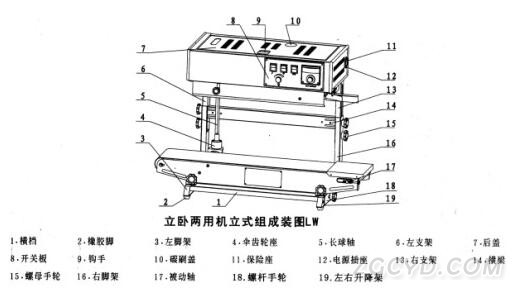 5.5 将长球轴套入机身孔内,左右支架同时套入左右脚架中,装上并旋紧螺母手轮,将封口机竖起放置,即可立式封口。