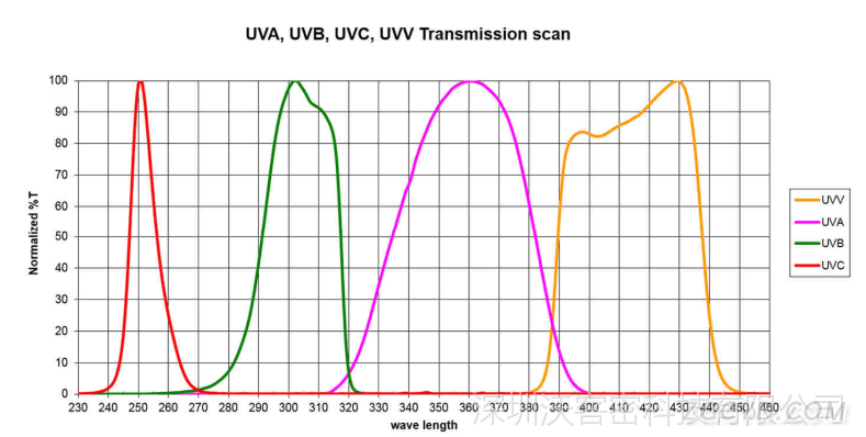 检测320-390nm (UVA)或者280-320nm (UVB)、 250-260nm (UVC)、395-445nm (UVV) |