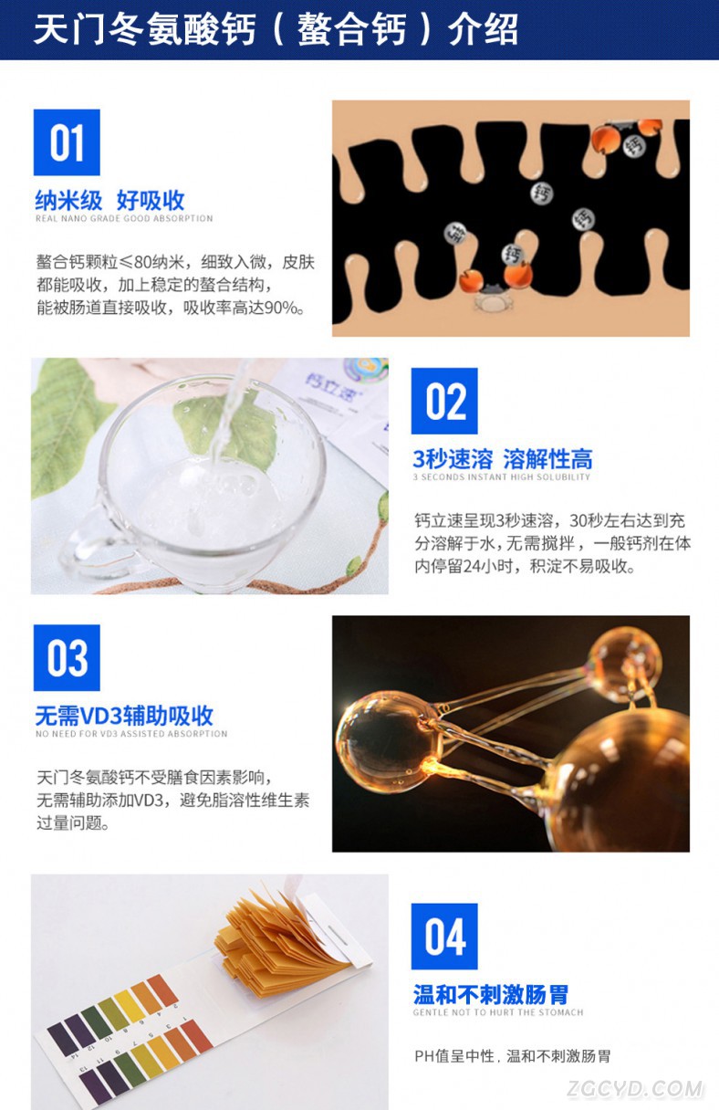 螯合钙是生物活性有机钙,比重为0.12,经过美国弗吉尼亚大学和香港科技大学检测鉴定为分子型钙源!螯合钙的高吸收率是传统钙剂的3倍!由于传统钙含有无机钙,而无机钙只有通过维生素D才能促进钙与蛋白酶结合,因此其它钙产品都需要添加维生素D。而螯合钙是氨基酸和钙的完全螯合物,故无需添加任何促进钙吸收的物质就可被人体直接吸收。