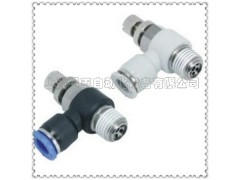 JSC系列节流阀标准型,可旋转360度,外螺纹带外六角,本体金属以黄铜制成,表面镀镍。塑料体黑色或灰白两种可供选择。使用条件:使用流体真空及压缩空气,使用压力:0.1-1.0Mpa,使用 温度:-5-60 度,可使适用软管:PU管,尼龙管; 耐压,:1.2Mpa