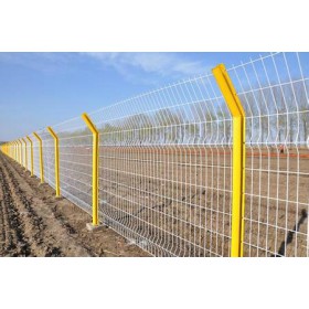 注:如果在机场护栏网顶部加装刀片刺丝、刀片刺网后又很好的增强了安全防护性能。采用电镀、热镀、喷塑、浸塑等防腐形式,具有很好的抗老化、抗晒、耐腐蚀等特点。其产品造型美观、花色多样,既起到围栏作用,又起到美化作用。由于具有安全性高、防攀爬能力好,网片连接方式采用SBS紧扣件,有效防止人为的破坏性拆卸,横向四道折弯加强筋,使网面强度显著增加。