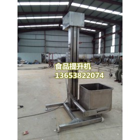 肉料提升机分为移动式提升机和固定式提升机两种机型,T200型提升机是专为200L标准肉车配套的提升设备,其功能是将肉料提升到一定高度后,倾倒至设备的料斗中,以完成加料工作。该机采用全不锈钢材料制造,链条传动,便于清洗,美观耐用。